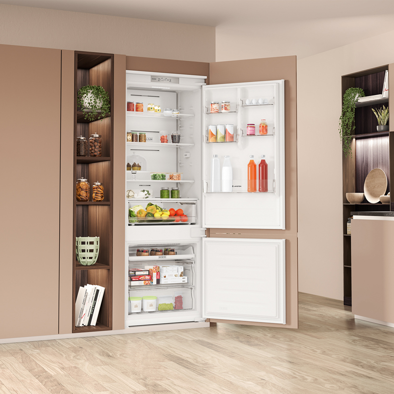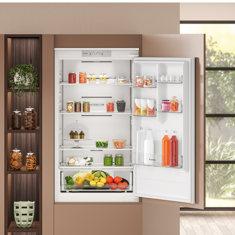 ثلاجة أريستون توفر سعة تخزين تصل إلى 394 لترًا، مما يجعلها الأكبر في فئتها من الثلاجات المدمجة. تقدم هذه الثلاجة مساحة تخزين أكبر بنسبة 50% مقارنةً بالثلاجات التقليدية ذات تقنية عدم التجميد، مما يوفر لك مساحة كافية لتخزين الطعام والمشتريات.