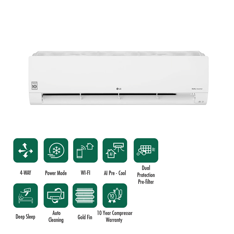 This model includes an Anti-Dust Gold Fin and a Dual Protection Pre Filter that together enhance the air quality while protecting the unit from dust and external pollutants. These features help in extending the life of the air conditioner by preventing the buildup of contaminants and ensuring efficient operation.